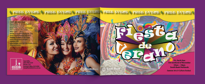 This four-page A5 flyer was created for a university assessment brief requiring a promotional program for Brisbane City Council’s annual Summer Latin Festival, Fiesta de Verano. The project focused on typographic excellence, layout structure, and cultural appeal.